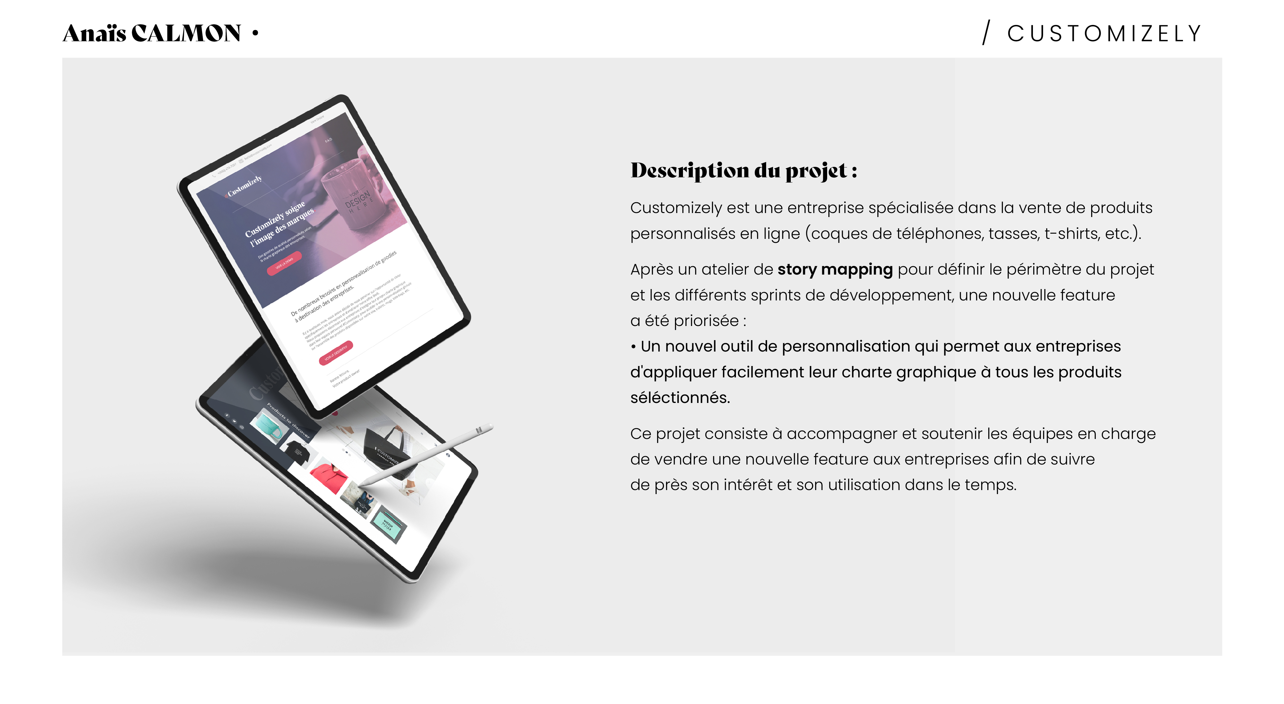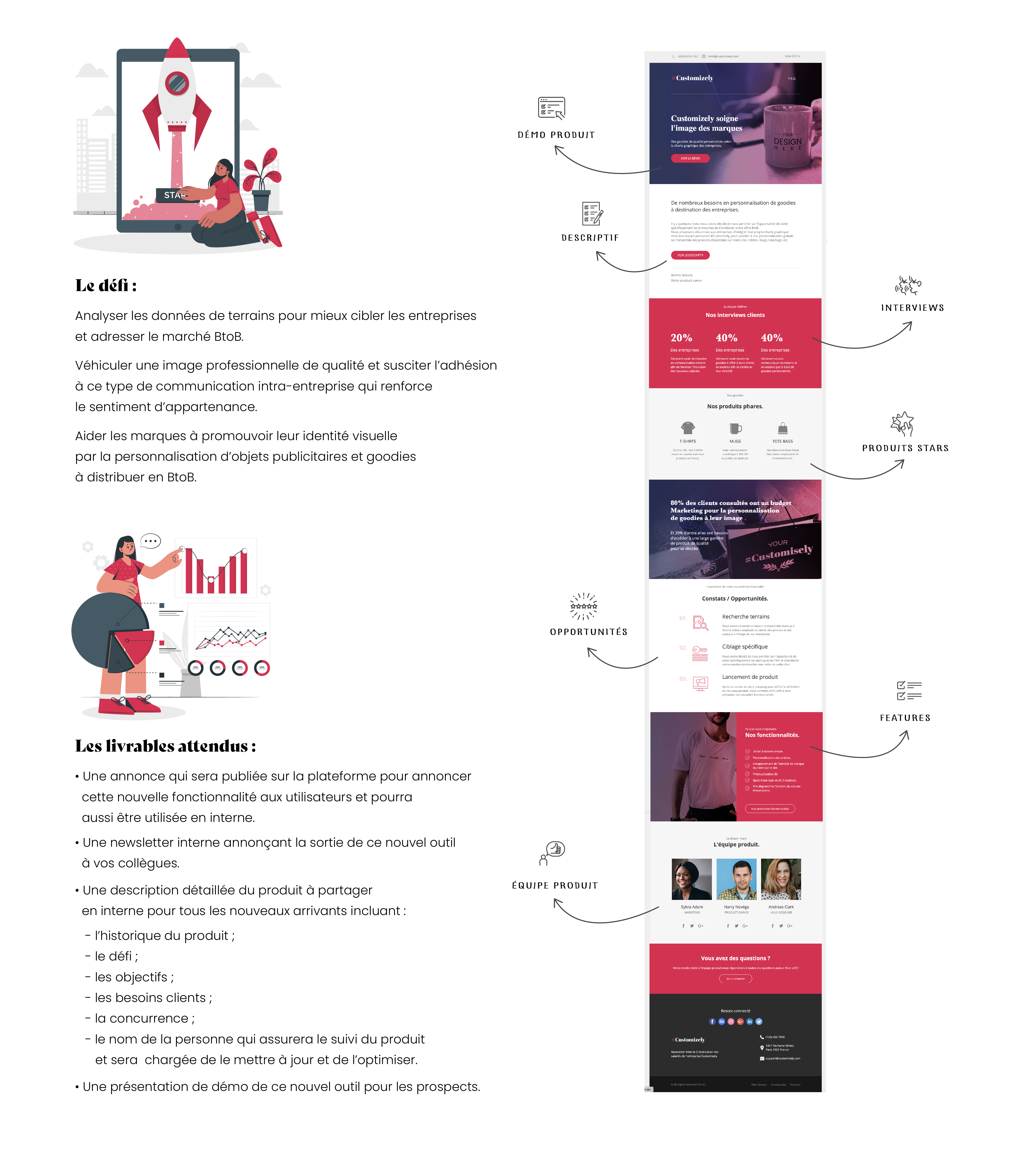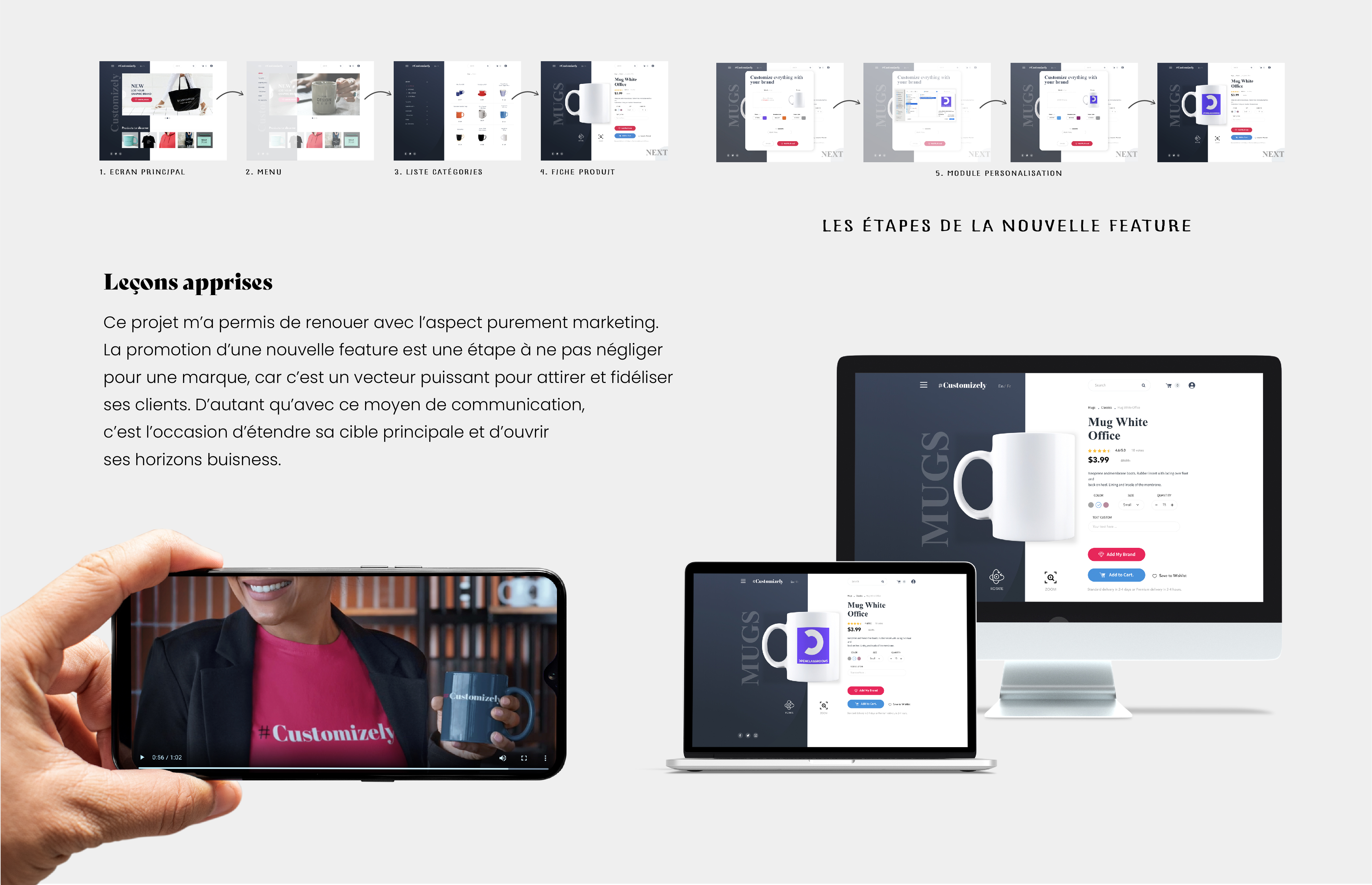 Customizely est un use case d'openClassRooms à réaliser durant la formation Product Manager. Les compétences évaluées pour ce projet étaient : La Préparation des équipes supports au lancement d'un produit et l'animation d'une démo produit dans le cadre d'une stratégie de communication d'une nouvelle fonctionnalité.