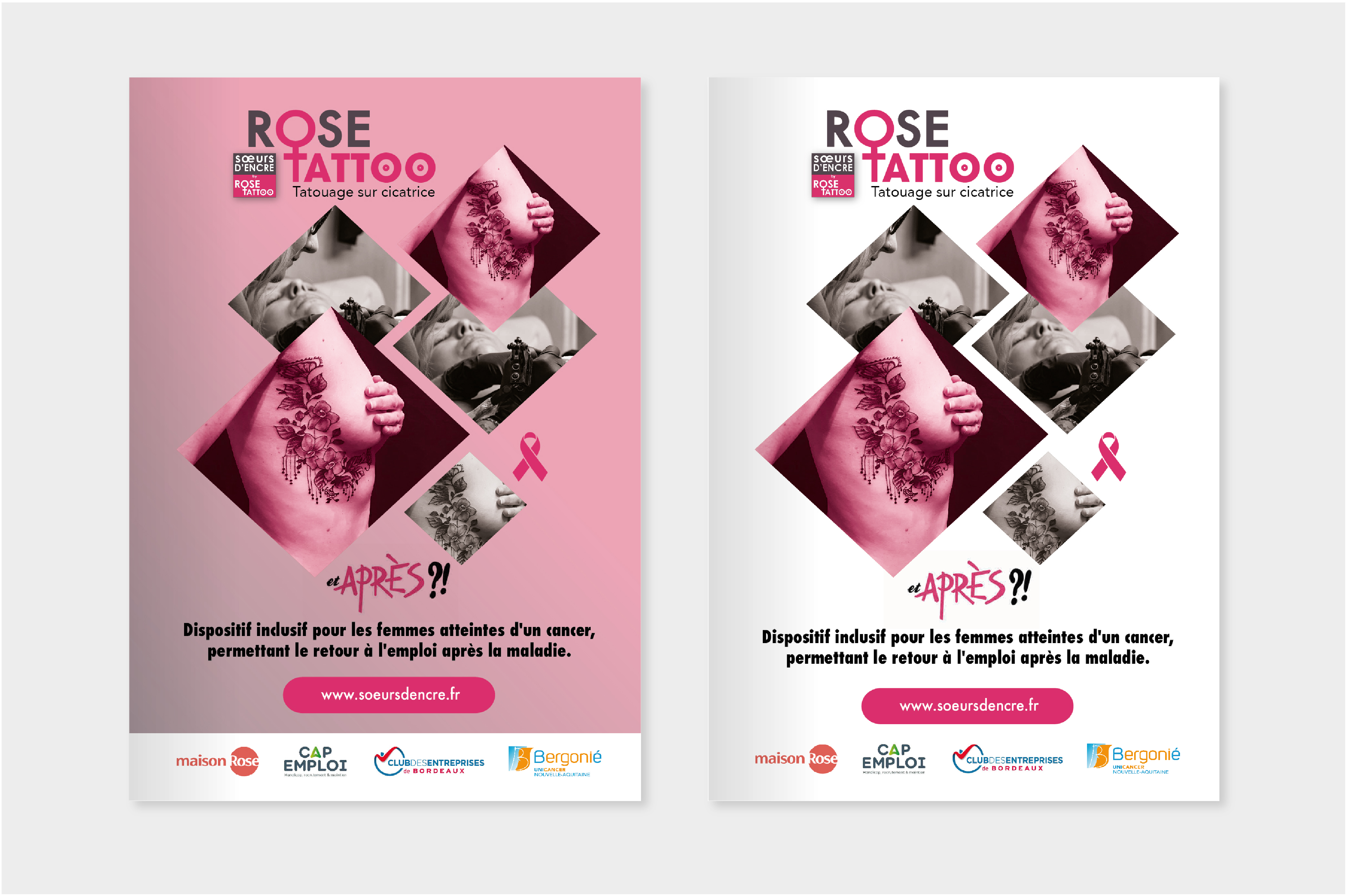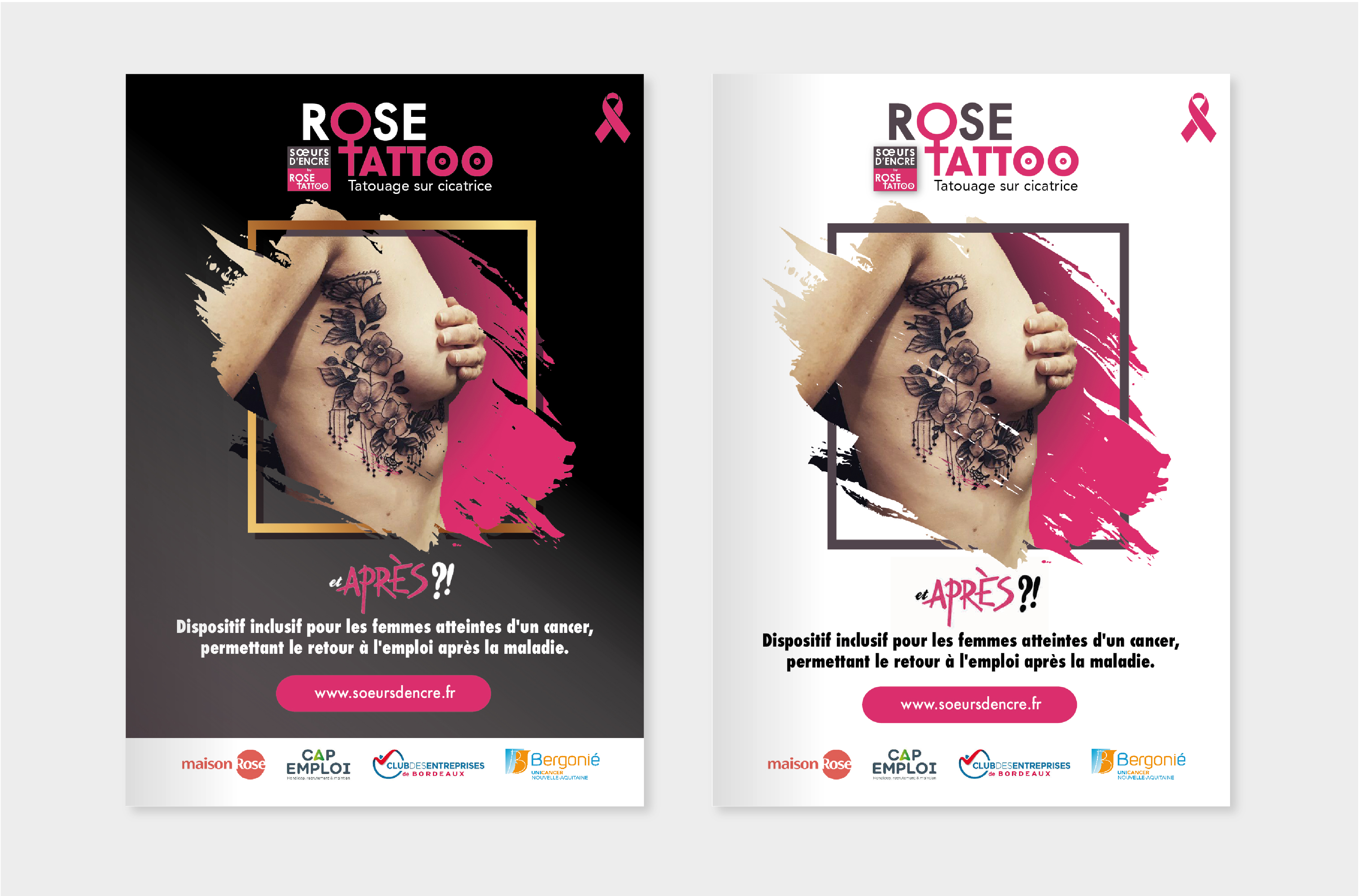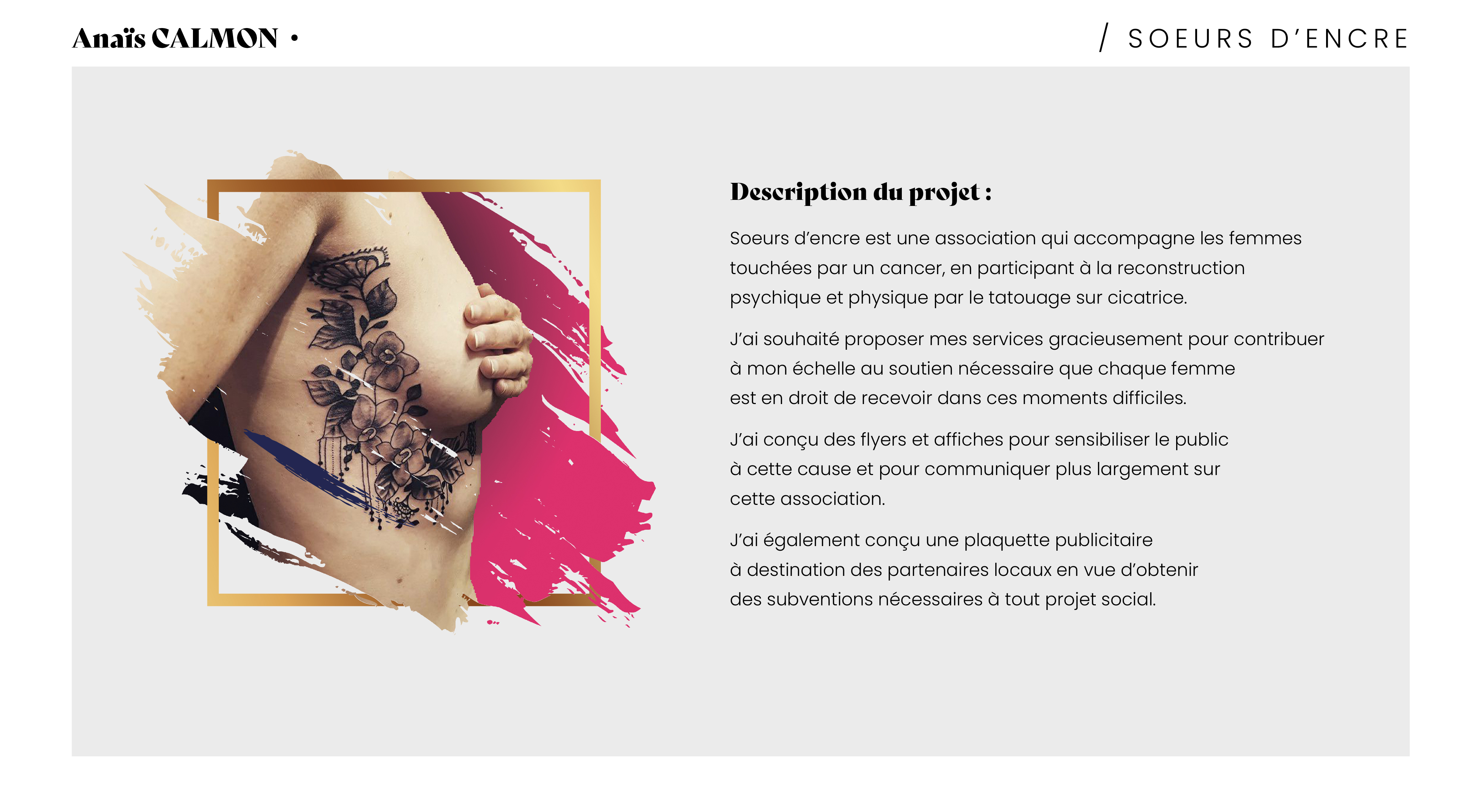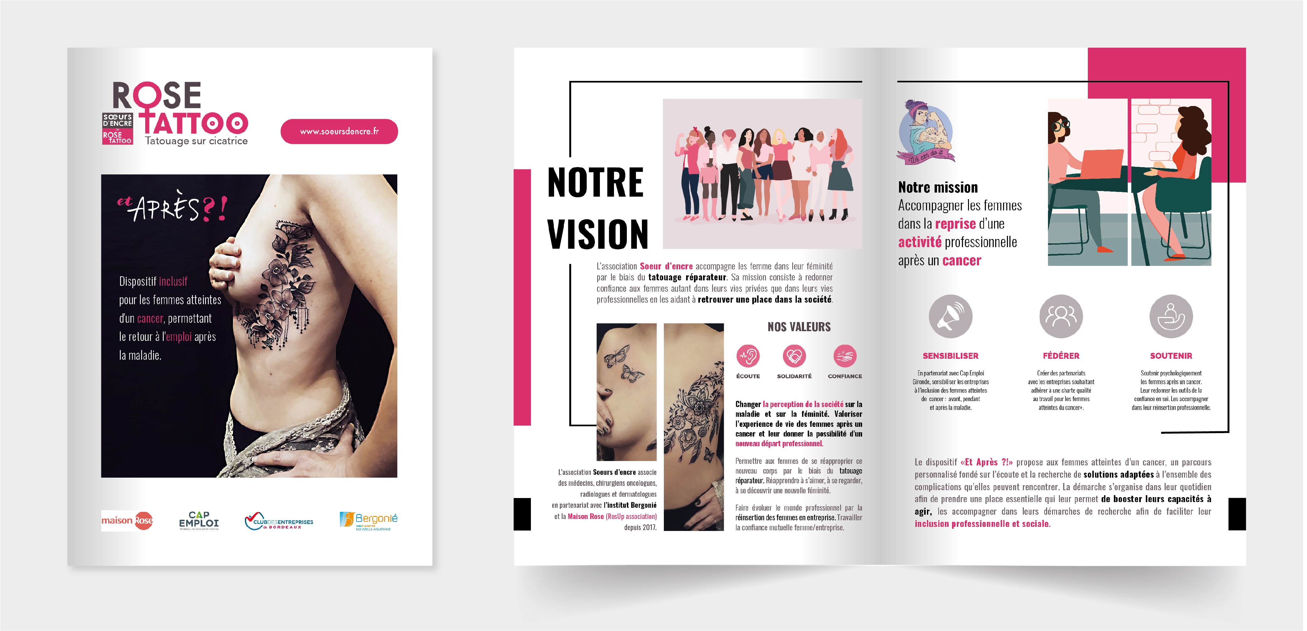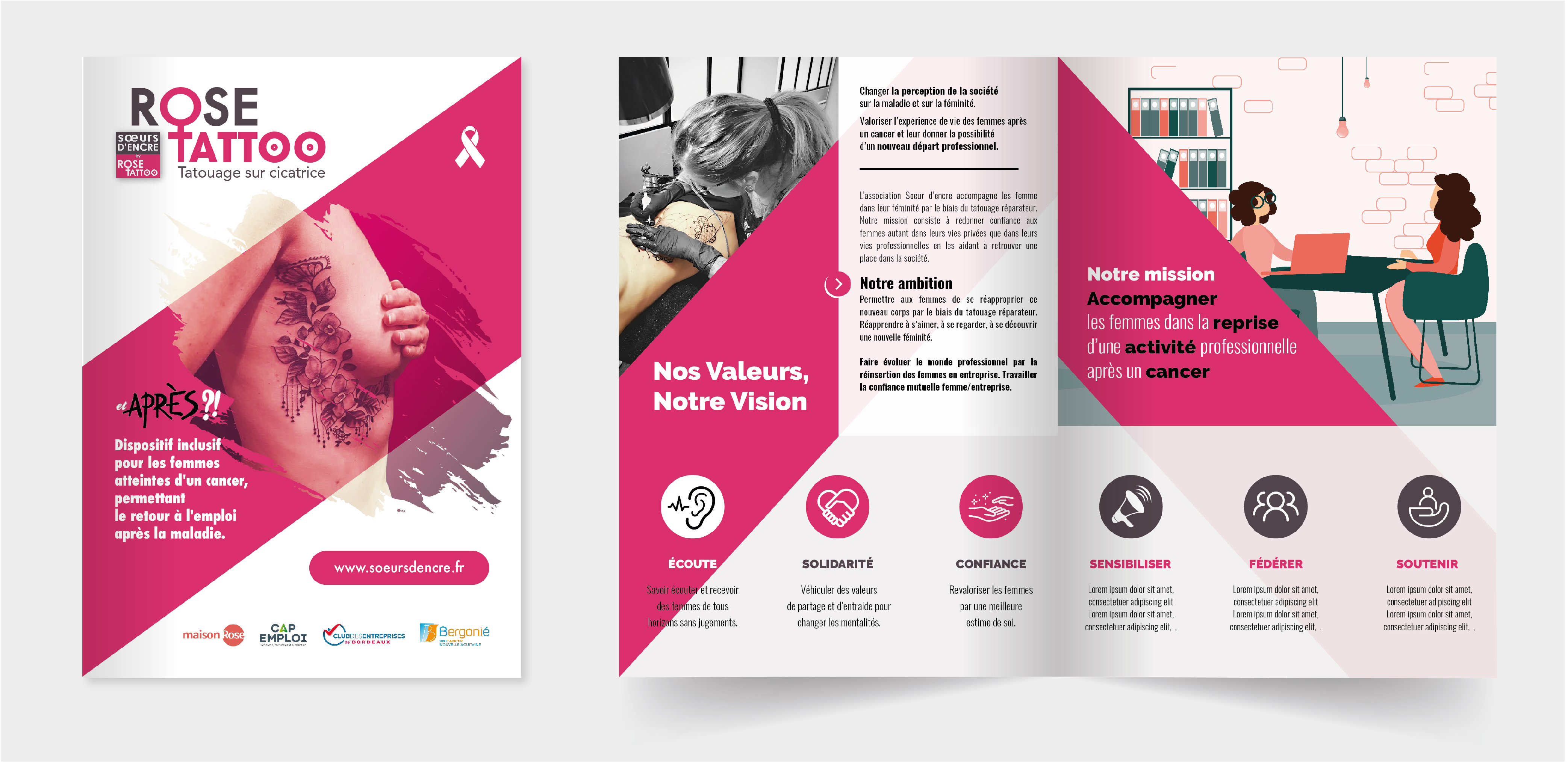 Soeurs d’encre est une association qui accompagne les femmes touchées par un cancer, en participant à la reconstruction psychique et physique par le tatouage sur cicatrice. J'ai réalisé différents supports Off-line pour l'association, flyers, affiches et plaquettes sous Illustrator et Phtoshop.